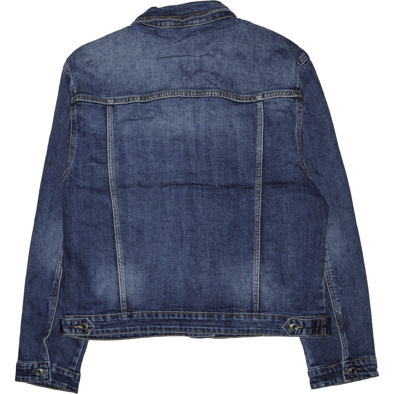 Középkék árnyalata elöl, hátul és a vállain divatos rodeó-koptatásokkal, tűzése narancssárga színű.