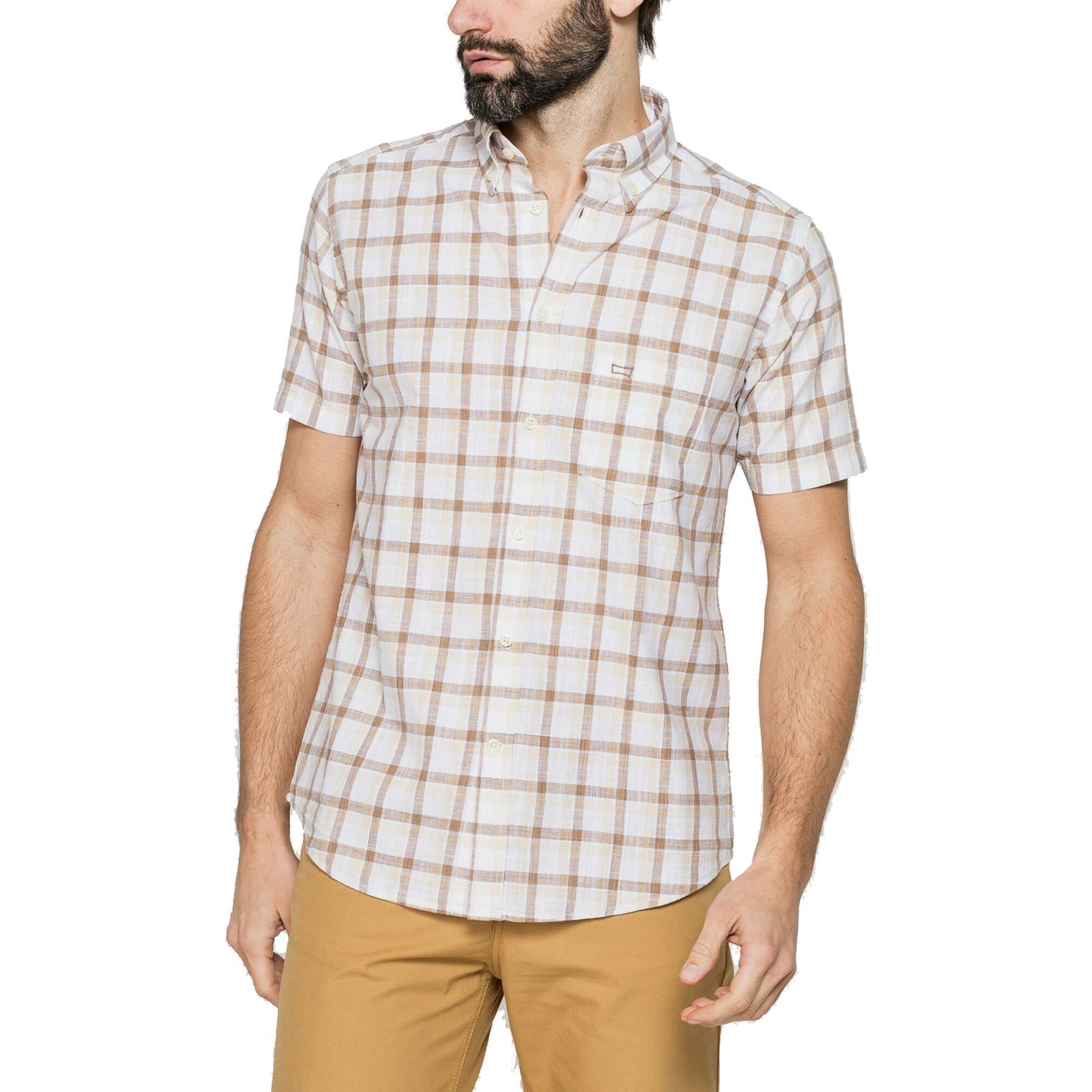 A Carrera® Jeans Regular Beige Short Sleeves Silver Cotton 213C1242A11B klasszikus szabású férfi rövid ujjú ing. Festett fonalból szőtt, fehér alapon narancssárga kockás mintával.