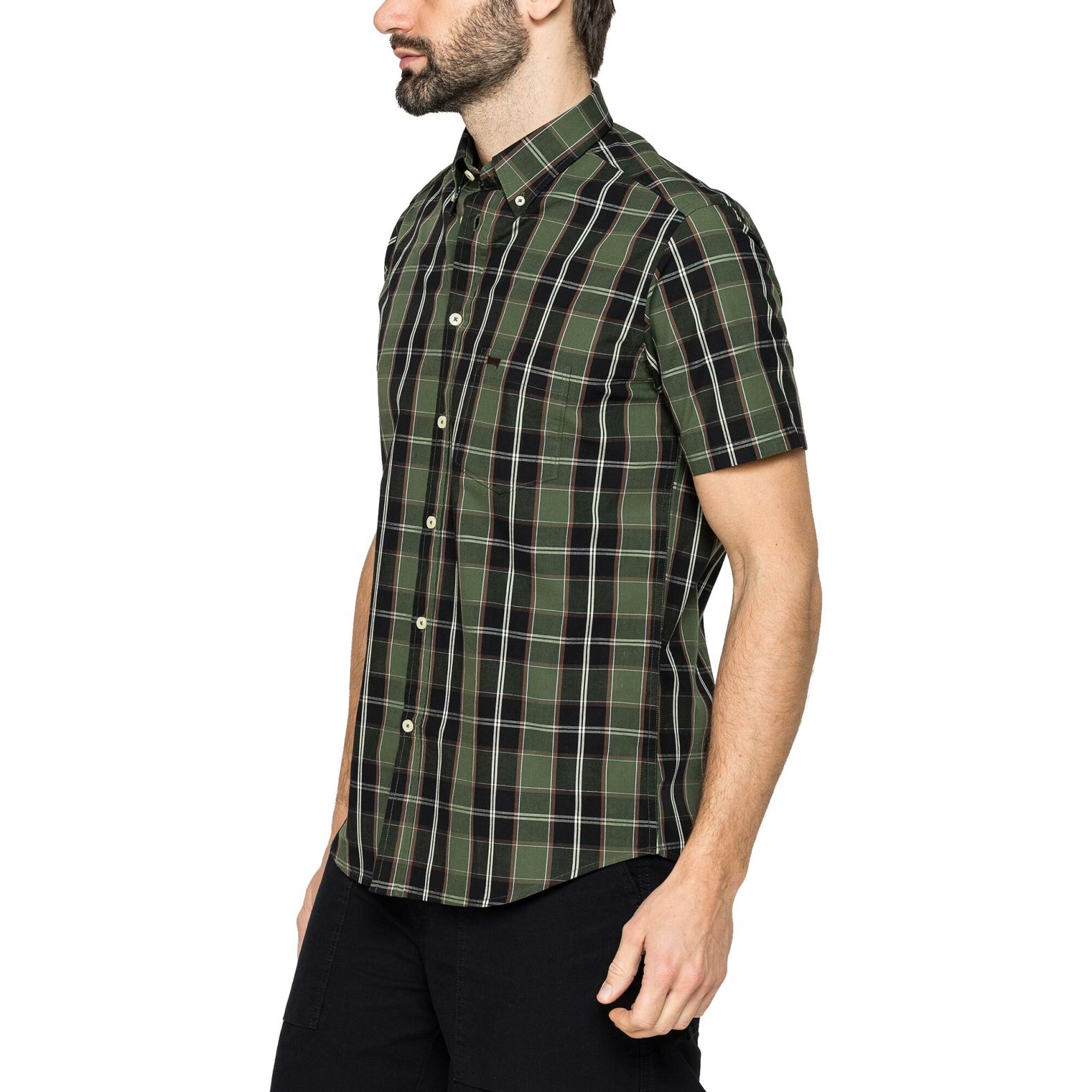 A Carrera® Jeans Regular Green Short Sleeves Pure Cotton 213C1230A49H klasszikus szabású férfi rövid ujjú ing. Festett fonalból szőtt, zöld-fekete-barne-fehér kockás mintával.