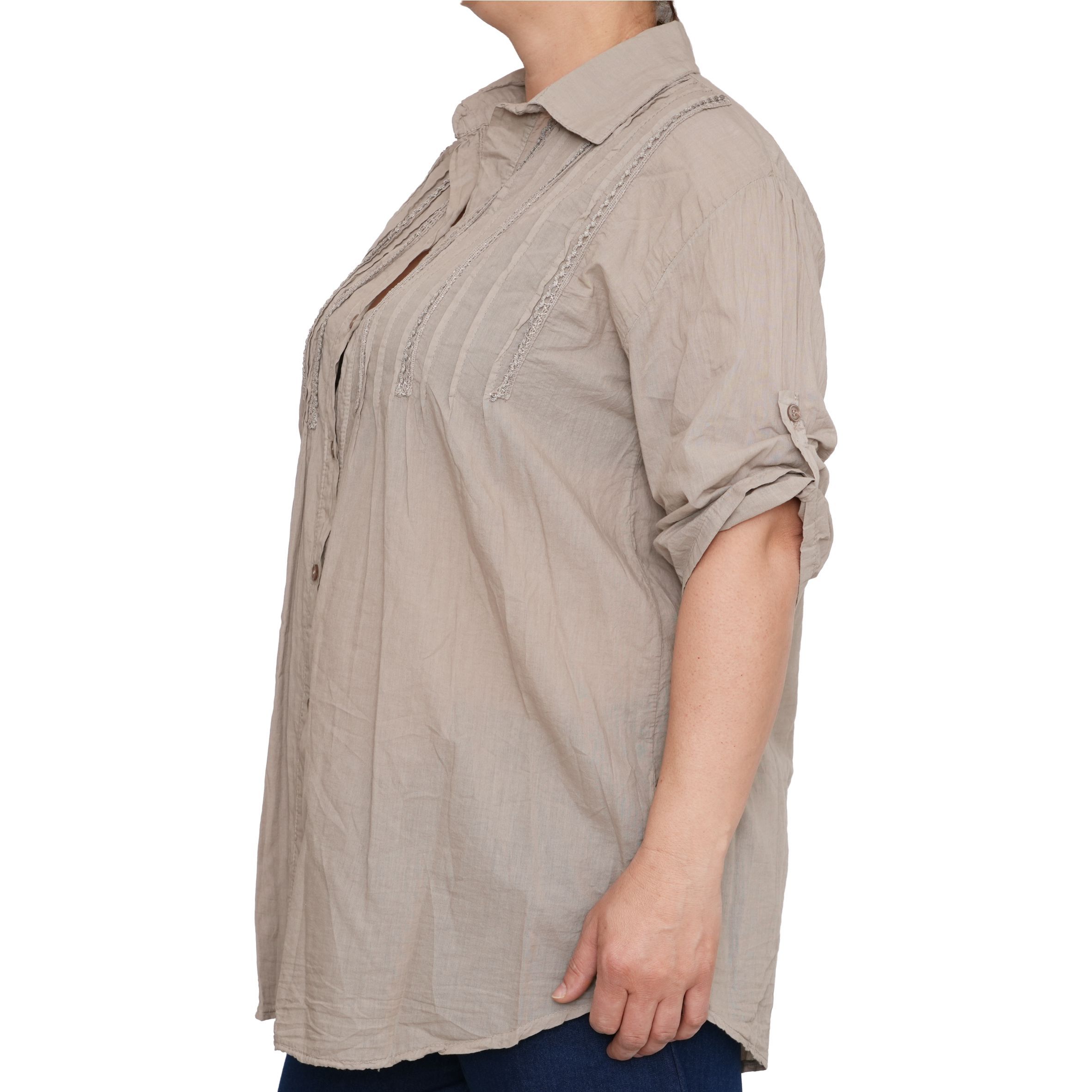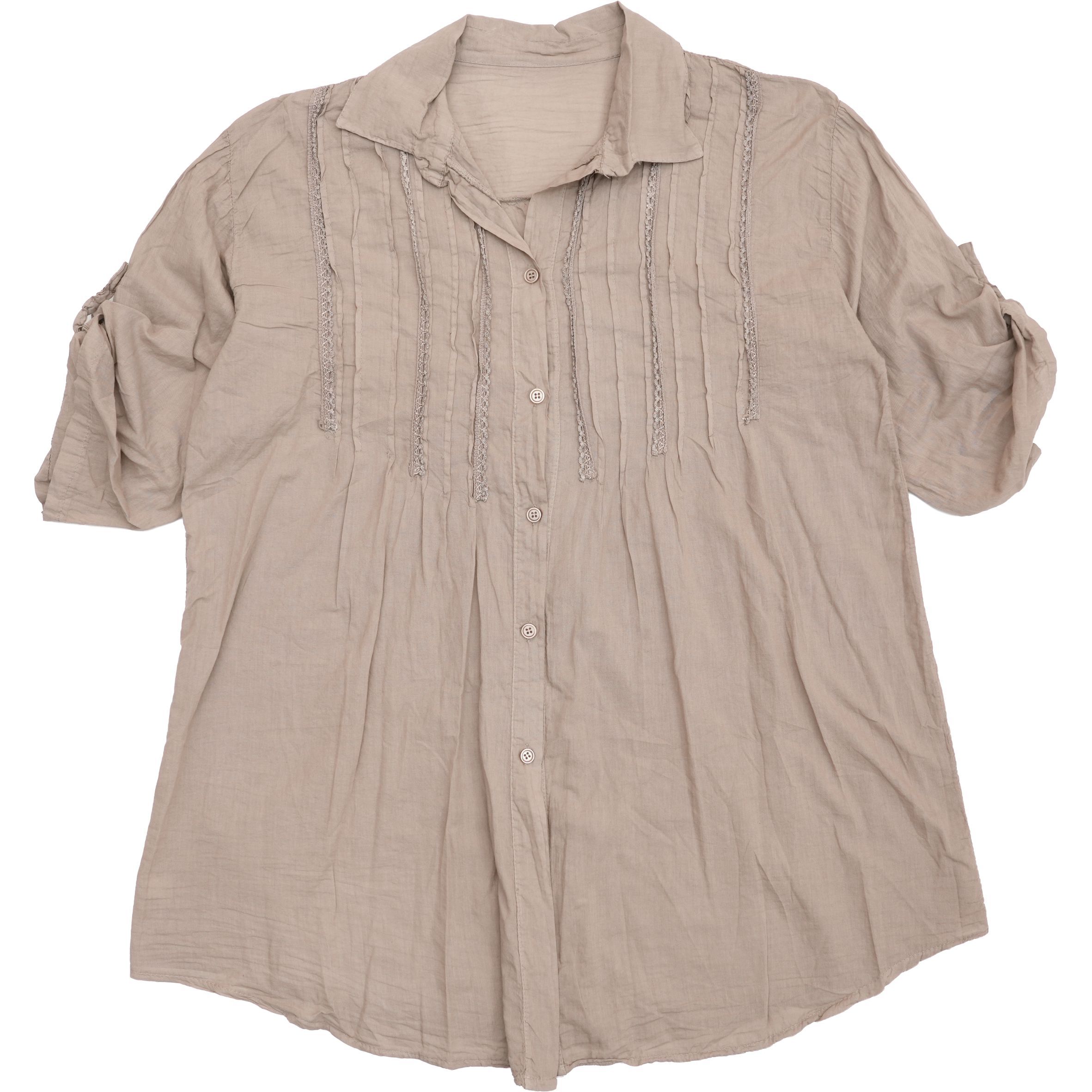 Végig gombos, a középhosszú ujja gombbal visszahajtható.