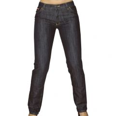 Sötét tónusú, magasított derekú, egyenes szárú női farmernadrág. Az igazi különlegessége a speciális eljárással szőtt szálkoptatott alapanyaga, amely 97% pamutot és 3% elasztánt tartalmaz. Ezen tulajdonságai miatt pont ott és pont annyit enged, amely éppen szükséges (kényelmi rugalmasság). Szinte minden alkalomra jól variálható, akár sportos, akár elegáns megjelenéshez. Koptatás nélkül készült, drapp és sárga tűzésekkel. Ötzsebes modell, szegecsek nélkül.