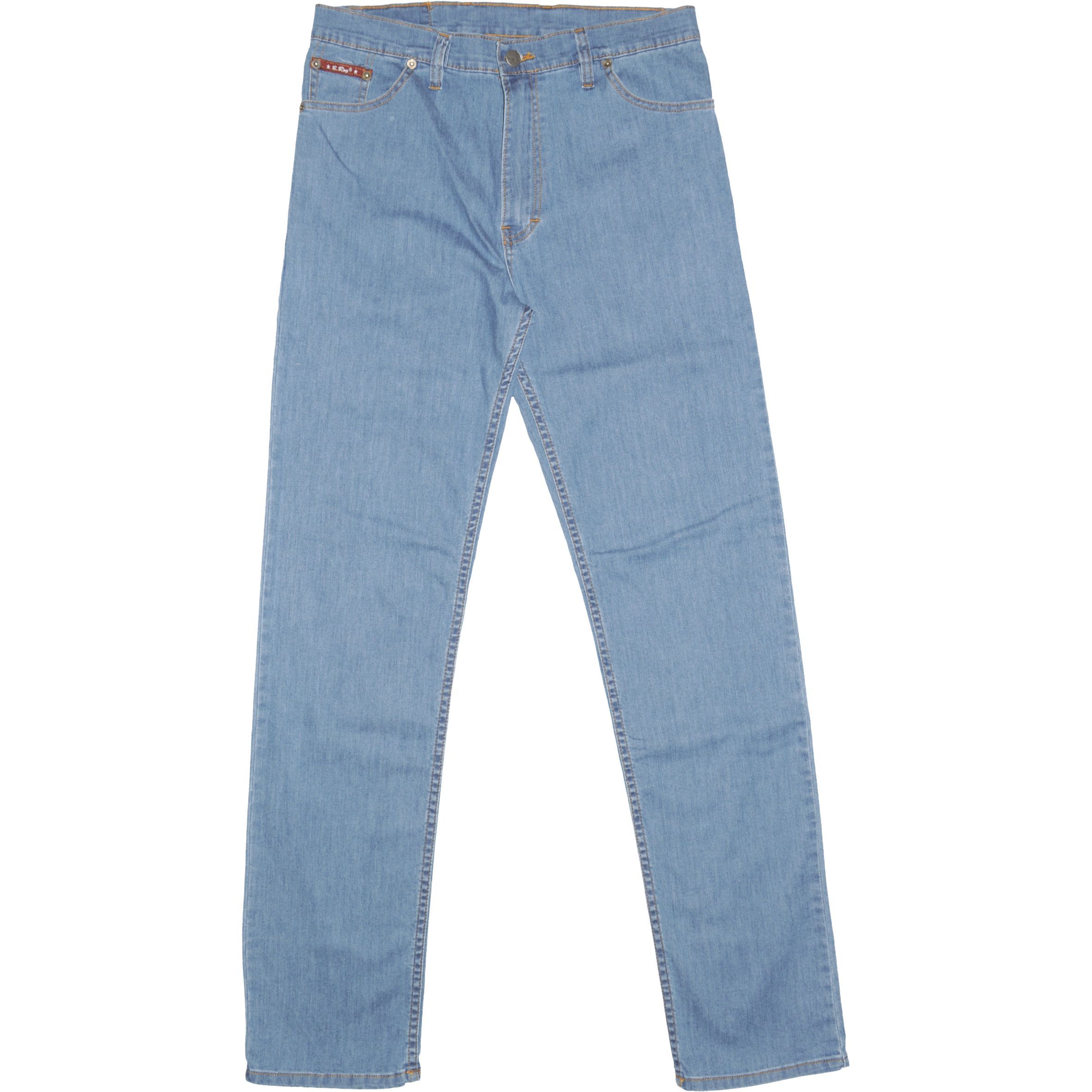Koptatás nélküli középkék árnyalata és narancssárga tűzései, valamint az első zsebeket erősítő szegecsei a hagyományos farmerek jellemzői.
