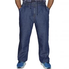 Gumírozott derekú, extra bő szabású, tisztán természetes pamutból készült farmernadrág.