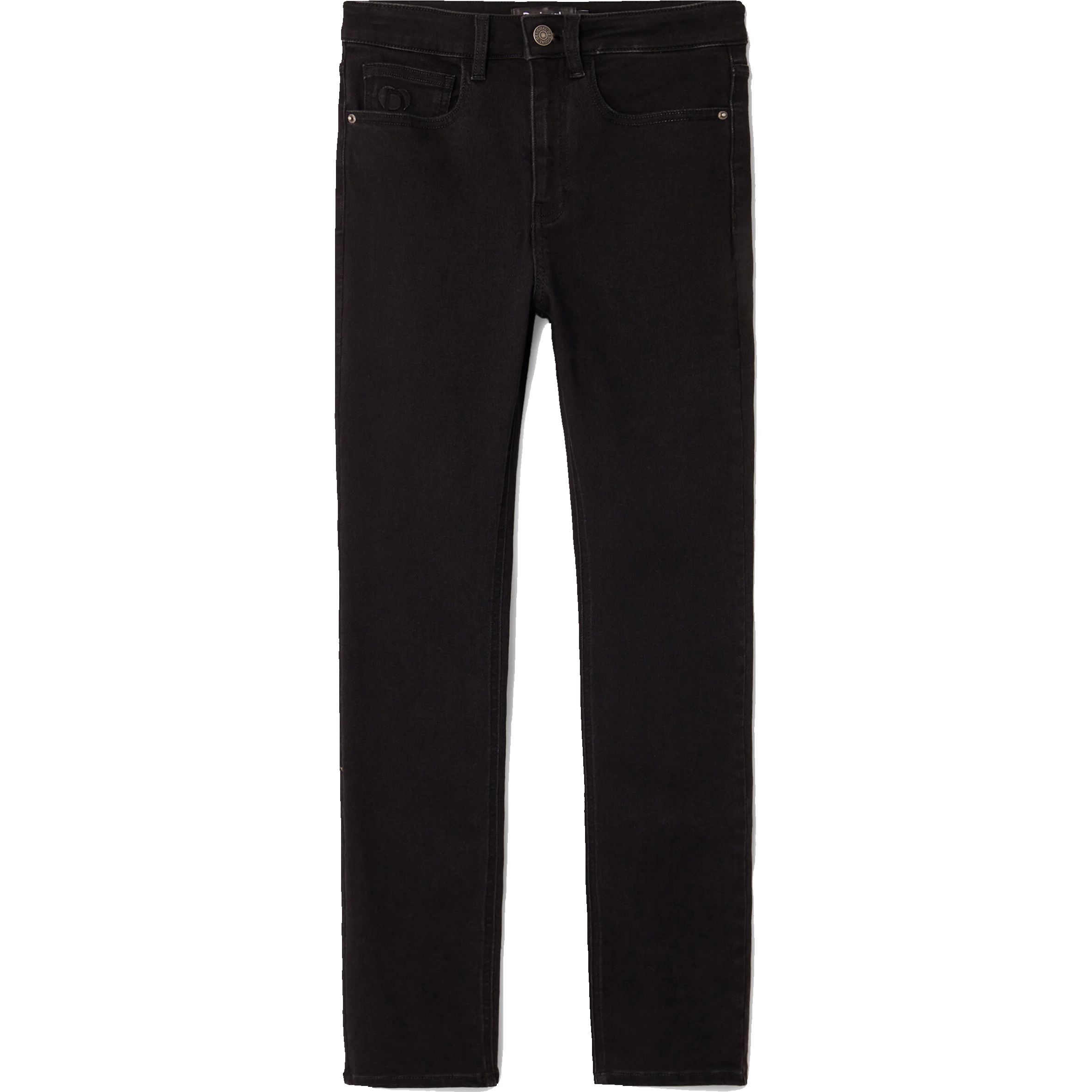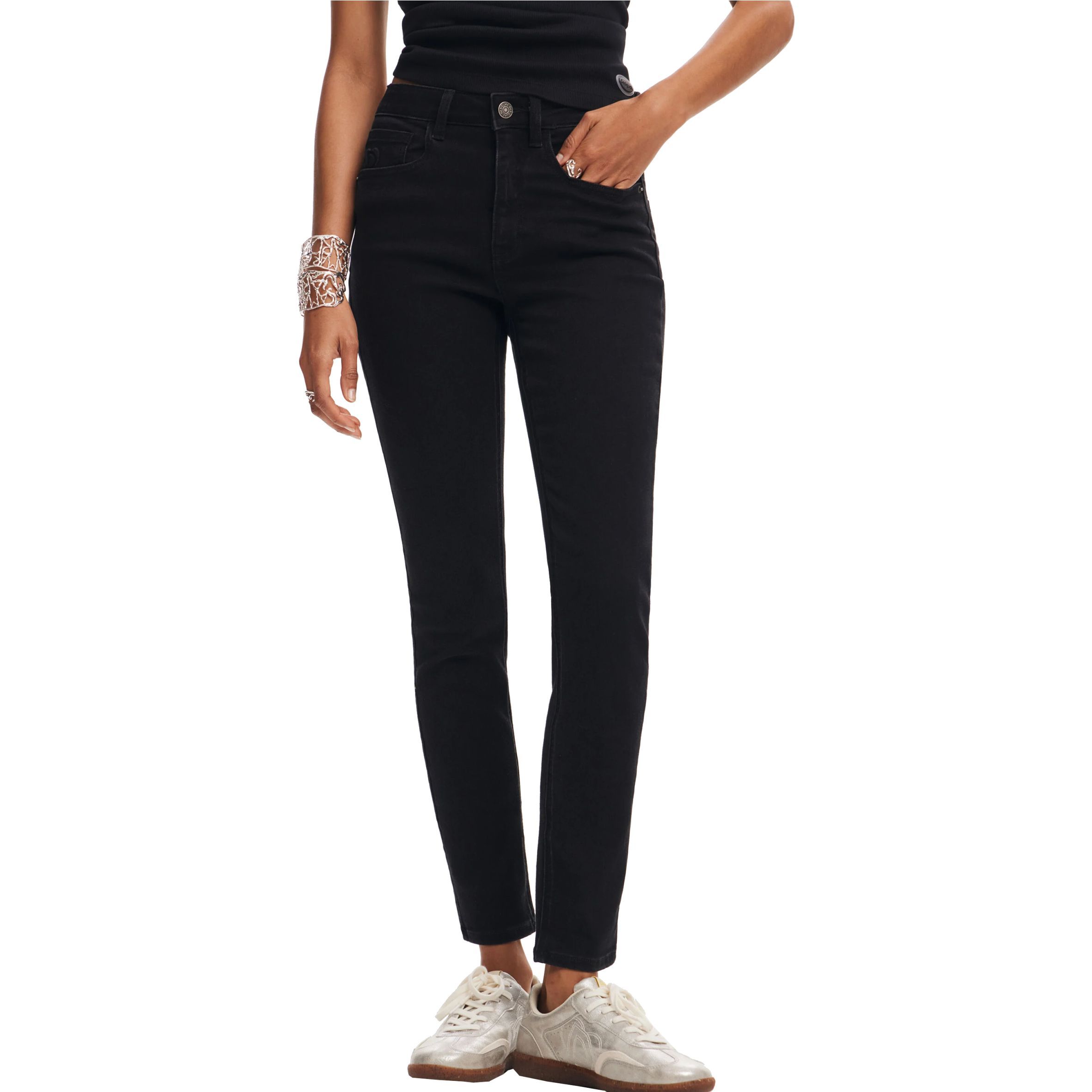 Magas derekú női farmer nadrág, szűk egyenes szárakkal, elülső és hátsó zsebekkel, gombbal és cipzárral záródik.