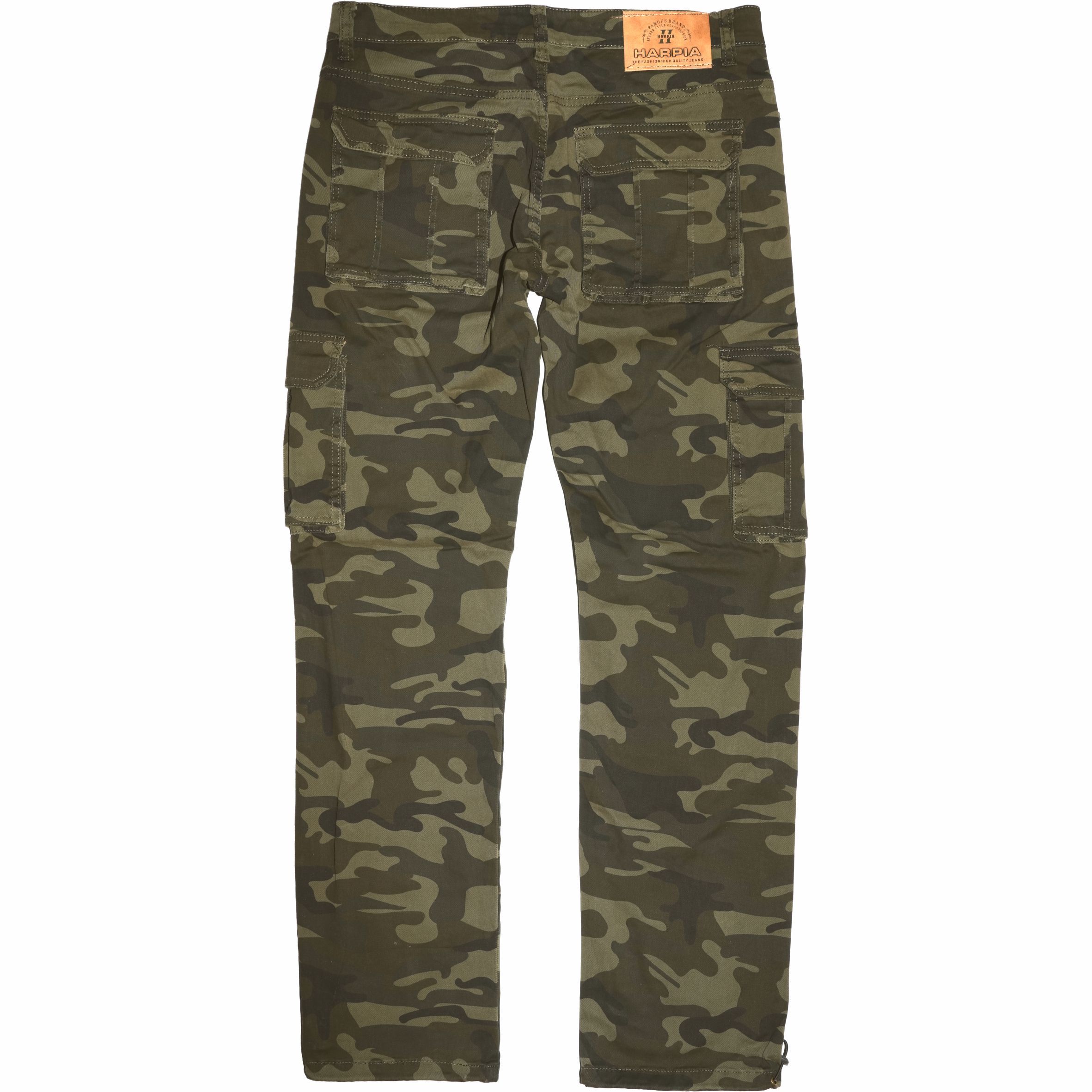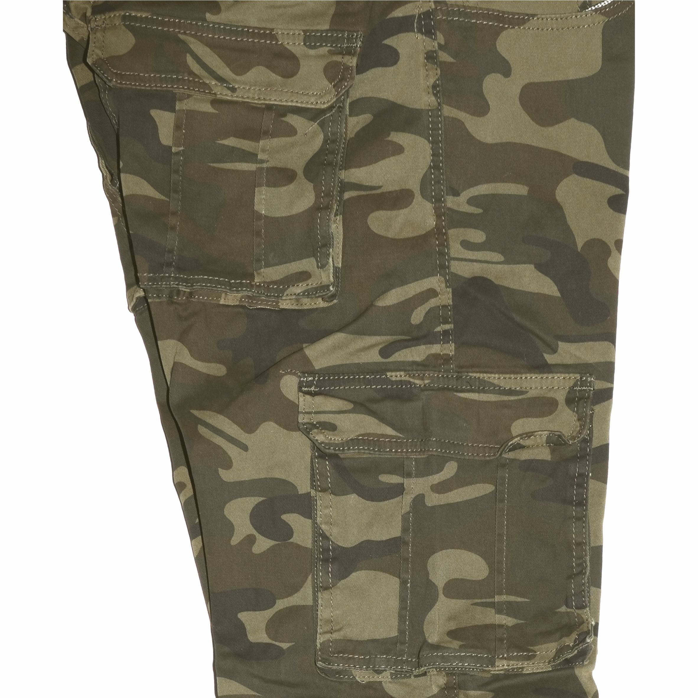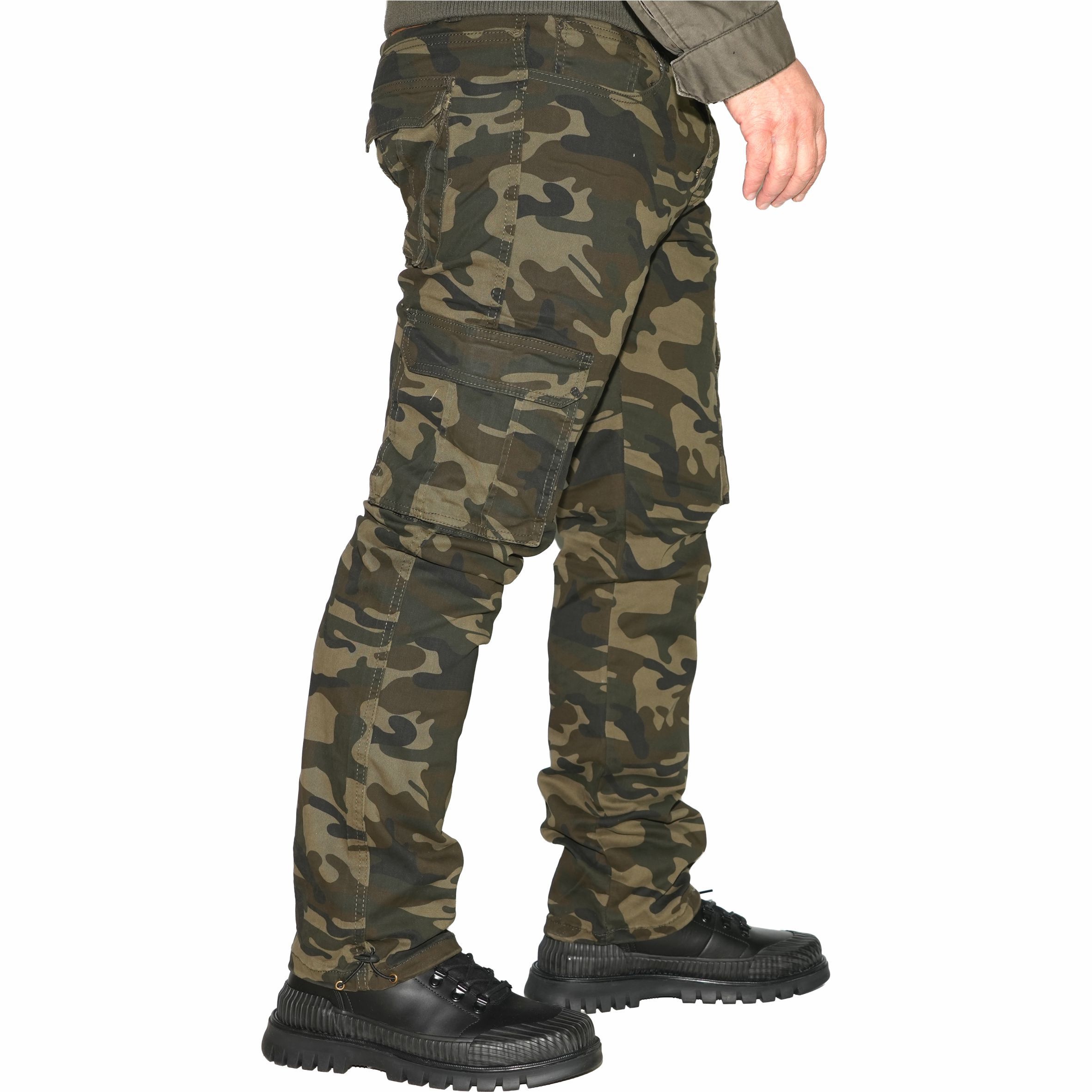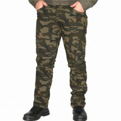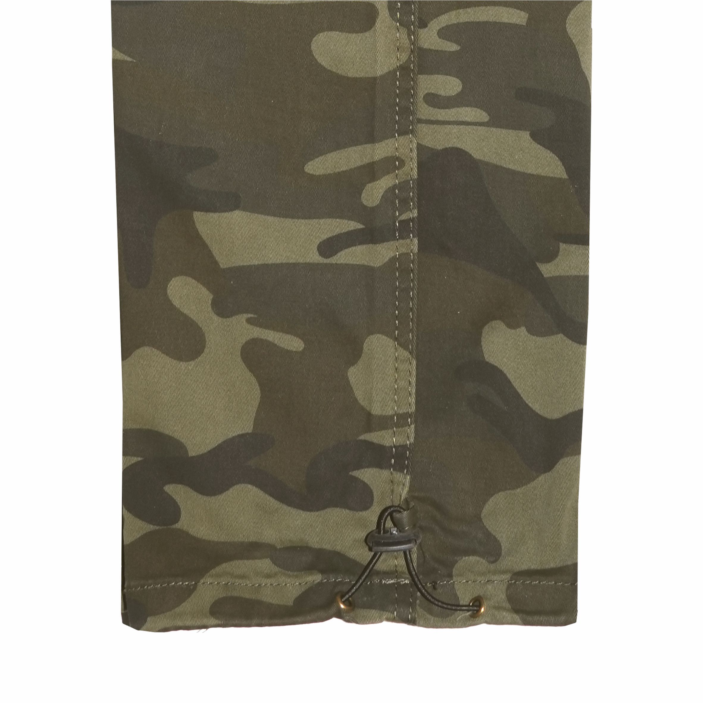 Természetes rugalmas pamut alapanyagból készült hagyományos fazonú oldalzsebes terepszínű nadrág.