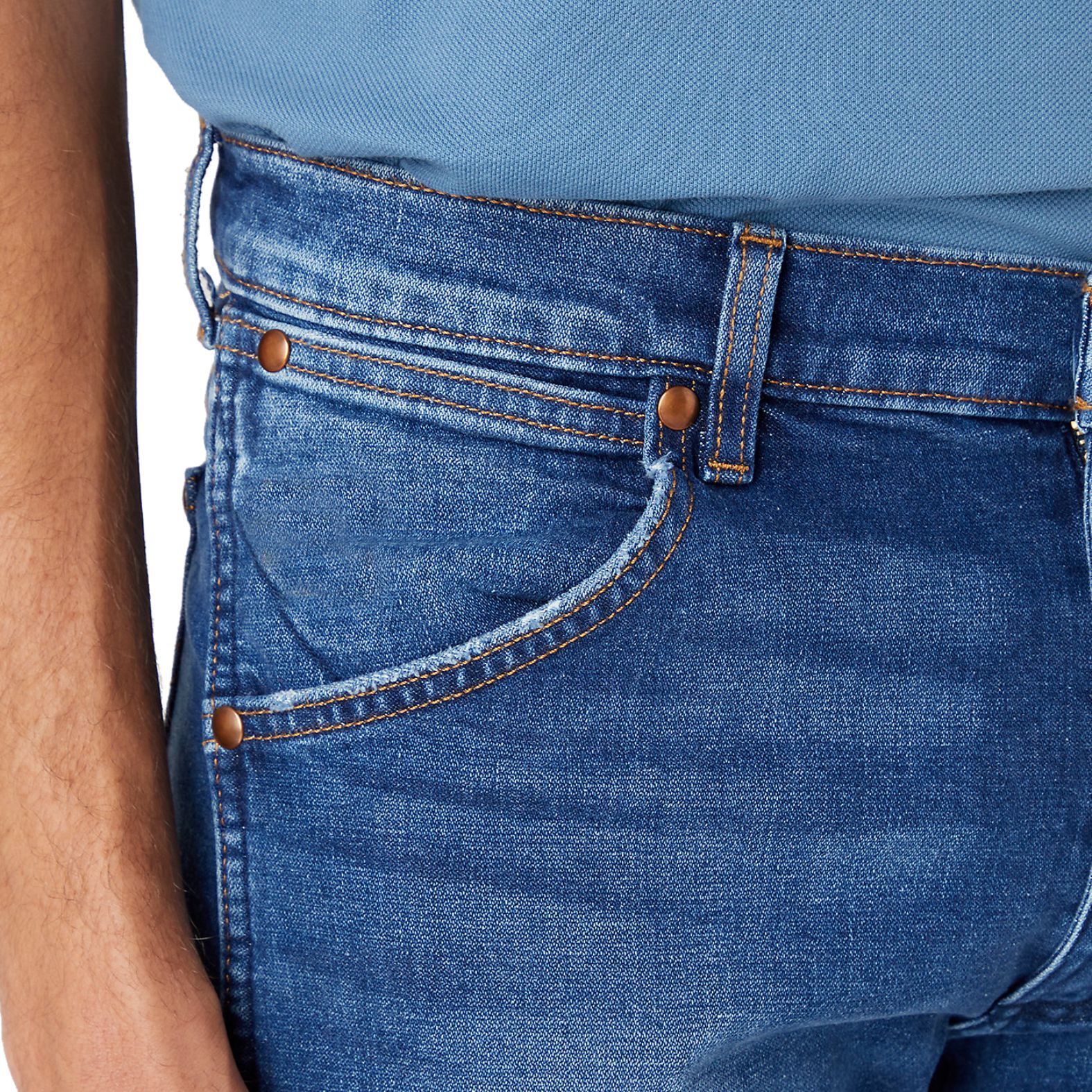 A letisztult Wrangler® 11MWZ 1 Year Original Slim Stretch W1MZUH924 különleges középkék-rodeó árnyalatát , narancssárga tűzések és a védjeggyé vált "W" tűzésű hátsózsebek, valamint az eredetiséget igazoló bőr logó teszi karakteressé és jól megkülönböztethetővé.