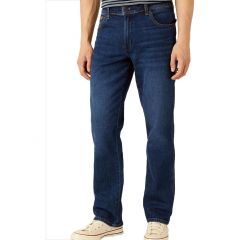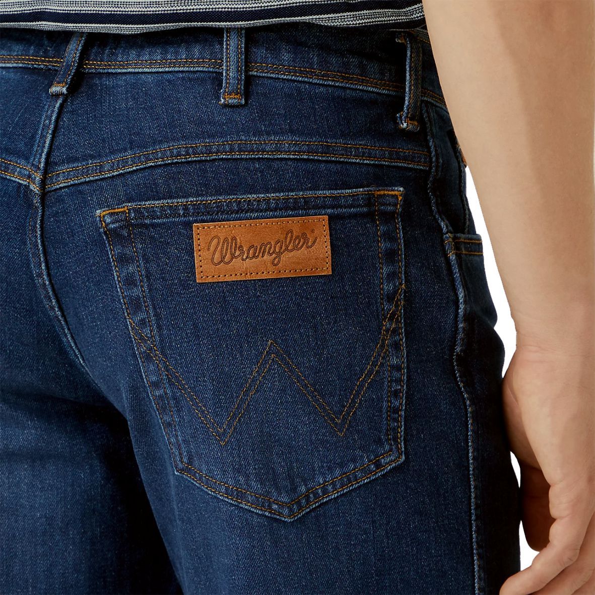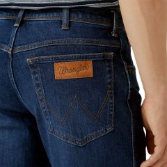 A letisztult Wrangler® Frontier 880 DBR Relaxed Straight Dancing Water W16VJX20C sötétkék enyhe rodeó-koptatással, narancssárga tűzésekkel és a védjeggyé vált "W" hátsózsebekkel, valamint az eredetiséget igazoló bőr logóval készült.
