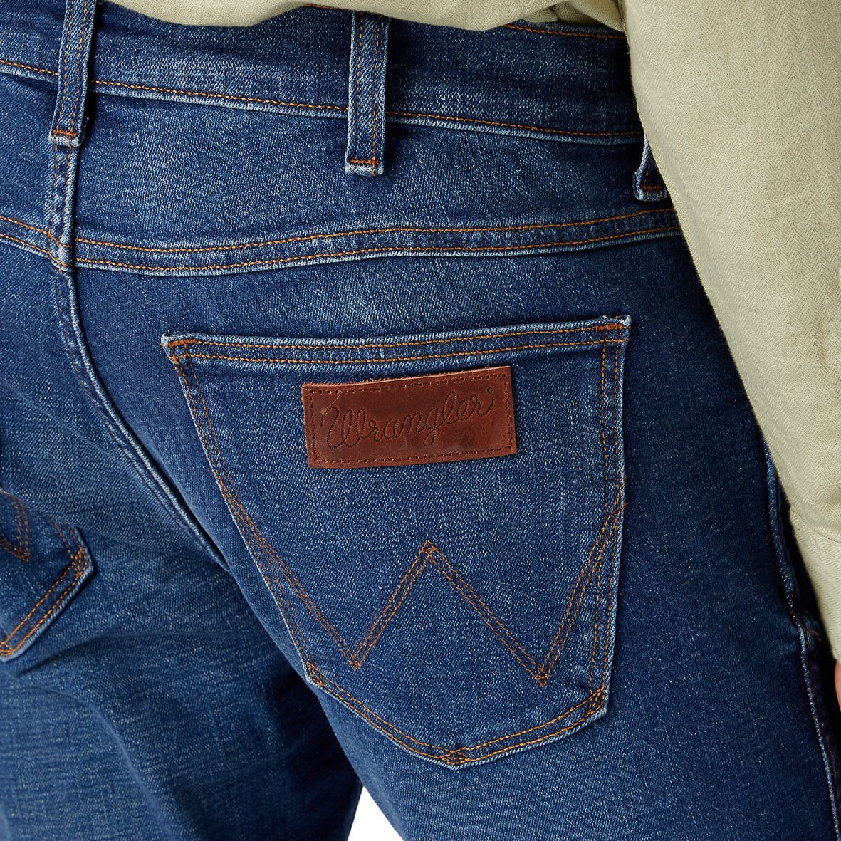 A Wrangler® Larston szabása a mindennapok favoritja: félcsípő derékmagasságú, szűk szárú, szegecsekkel erősített ötzsebes szabásvonalú, cipzáras záródású farmer nadrág.