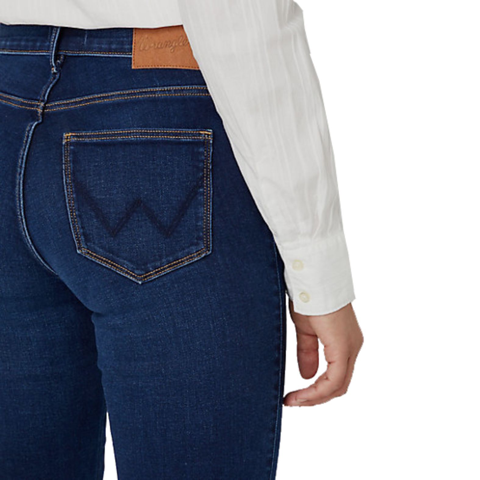 A letisztult Wrangler® Straight 4W DBR Anabel W26RCY37Q különleges sötétkék árnyalatát enyhe rodeó-koptatások, narancssárga tűzések és a védjeggyé vált "W" tűzésű hátsózsebek, valamint az eredetiséget igazoló bőr logó teszi karakteressé és jól megkülönböztethetővé.