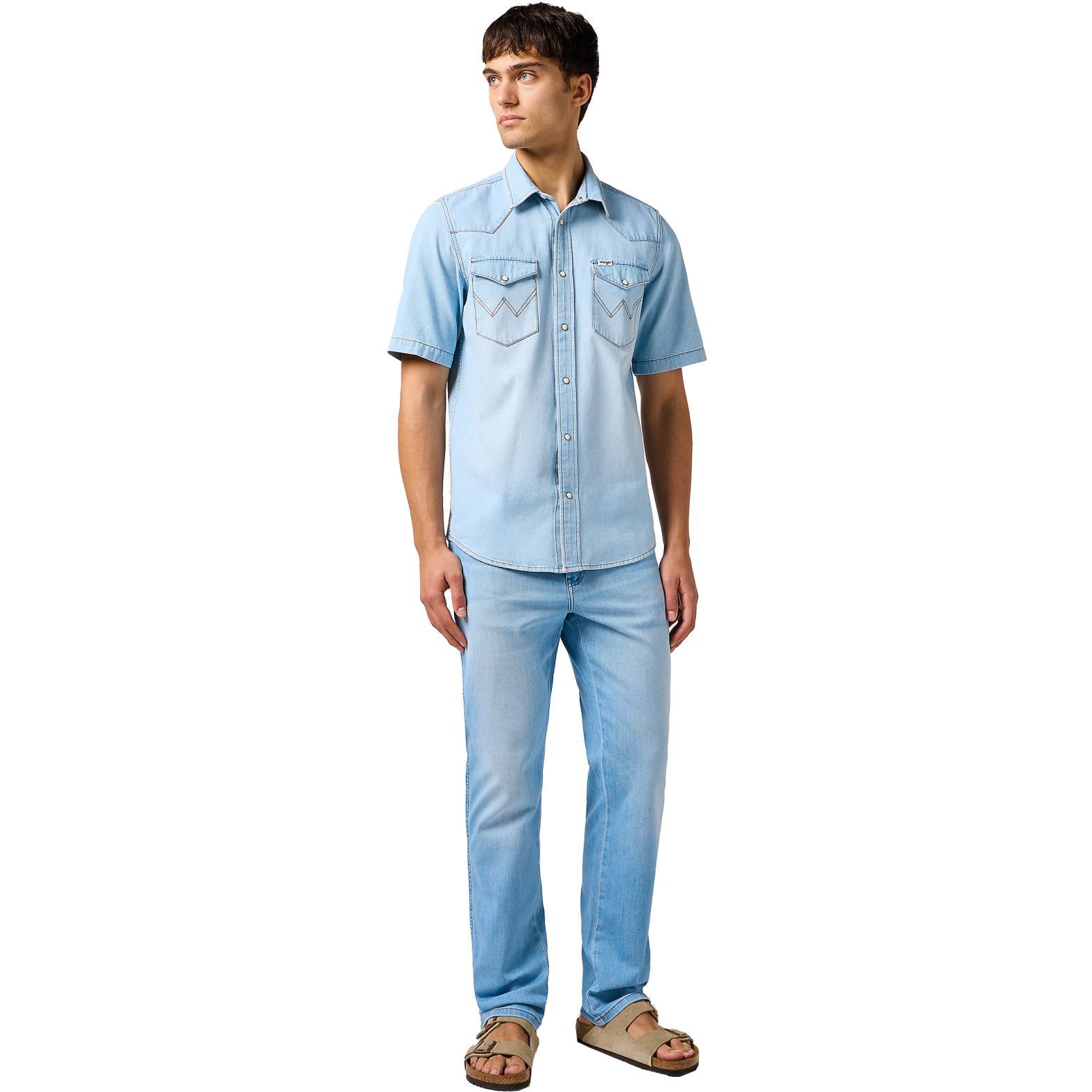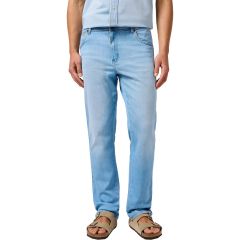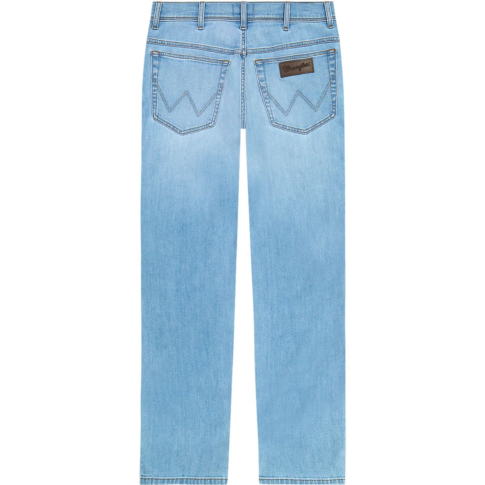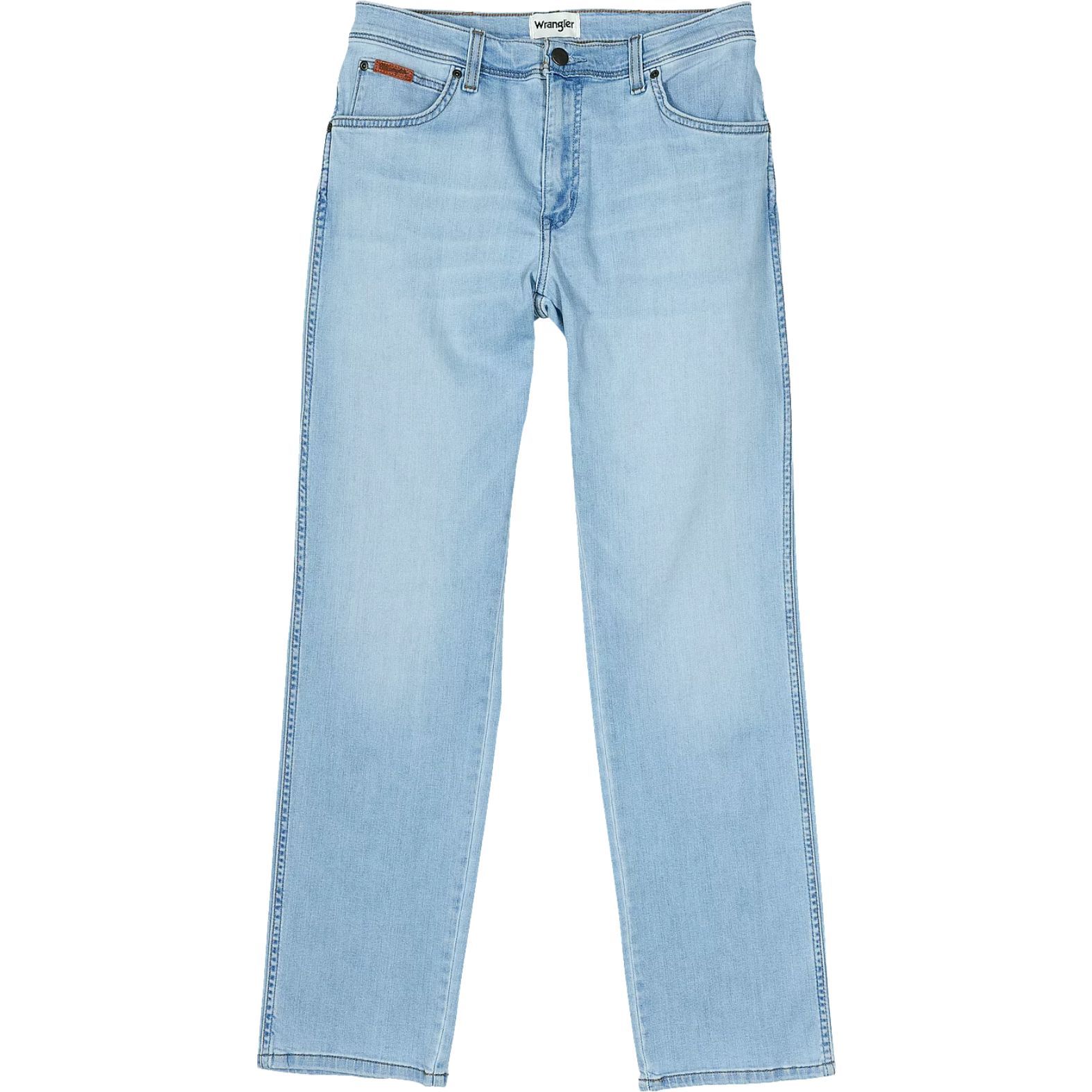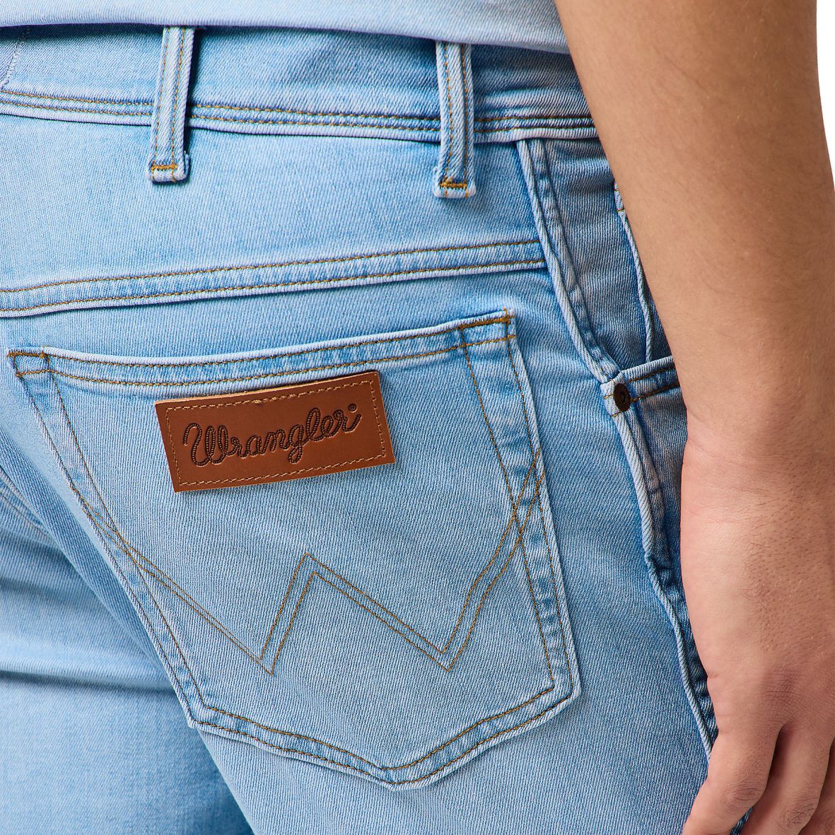 A Wrangler® Texas 821 LBR Straight Stretch Cool Light 112362482 könnyű nyári alapanyaga, koptatott világoskék árnyalata és narancssárga tűzései különleges összhangot teremt.