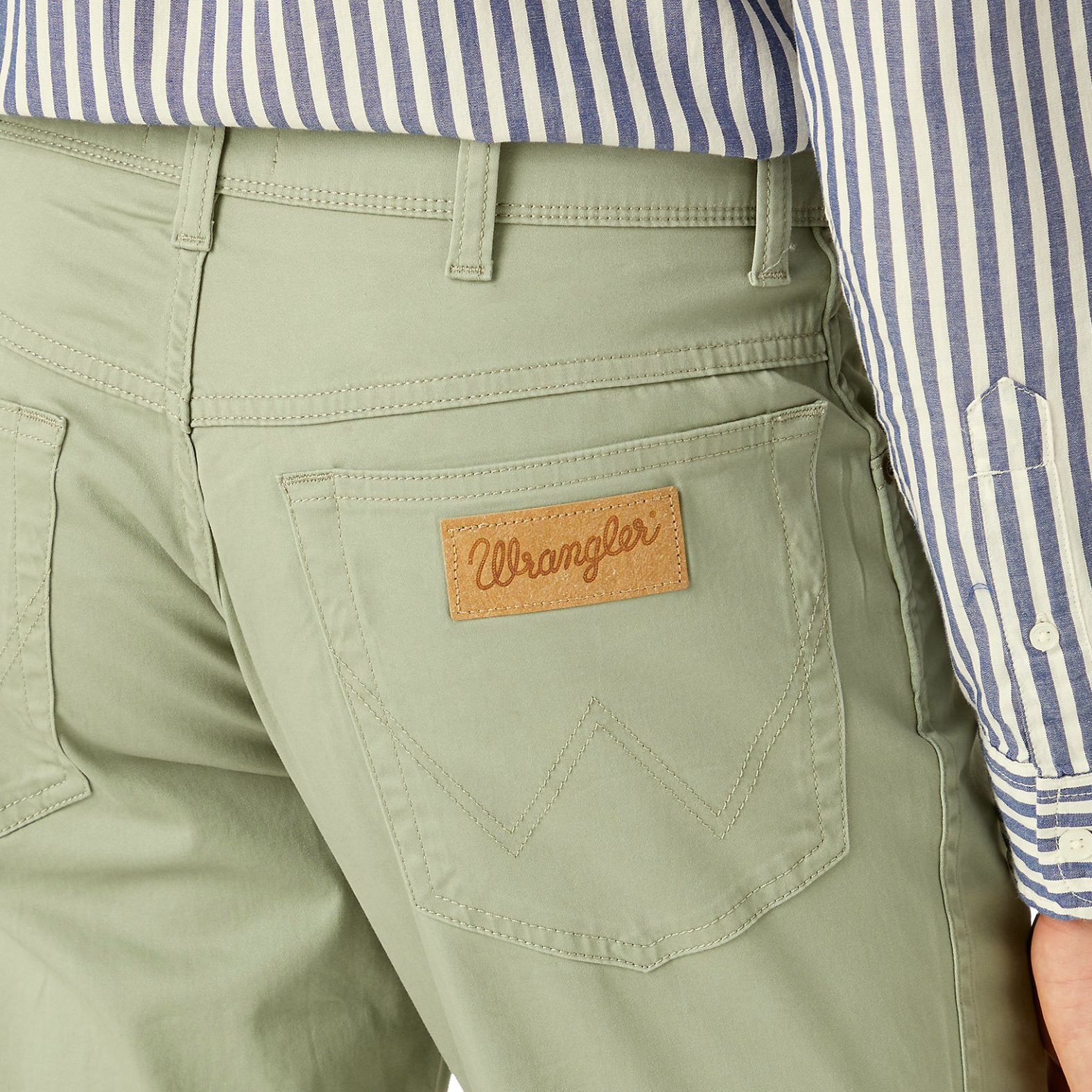 A letisztult Wrangler® Texas Slim 822 Sea Grass LightTwill Stretch W12SEA38X világos keki árnyalata homogén, koptatásmentes. Az alapanyaggal megegyező tűzései a védjeggyé vált "W" hátsózsebekkel, valamint az eredetiséget igazoló bőr logóval készült.