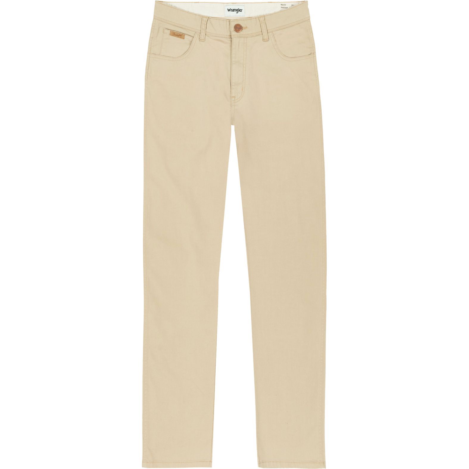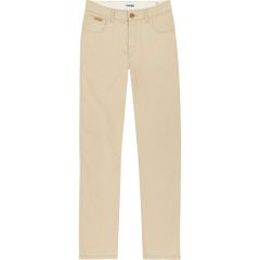 A letisztult Wrangler® Texas Slim 822 LB LightTwill Stretch Safari W12SEA38V világos drapp árnyalata homogén, koptatásmentes. Az alapanyaggal megegyező tűzései a védjeggyé vált "W" hátsózsebekkel, valamint az eredetiséget igazoló bőr logóval készült.