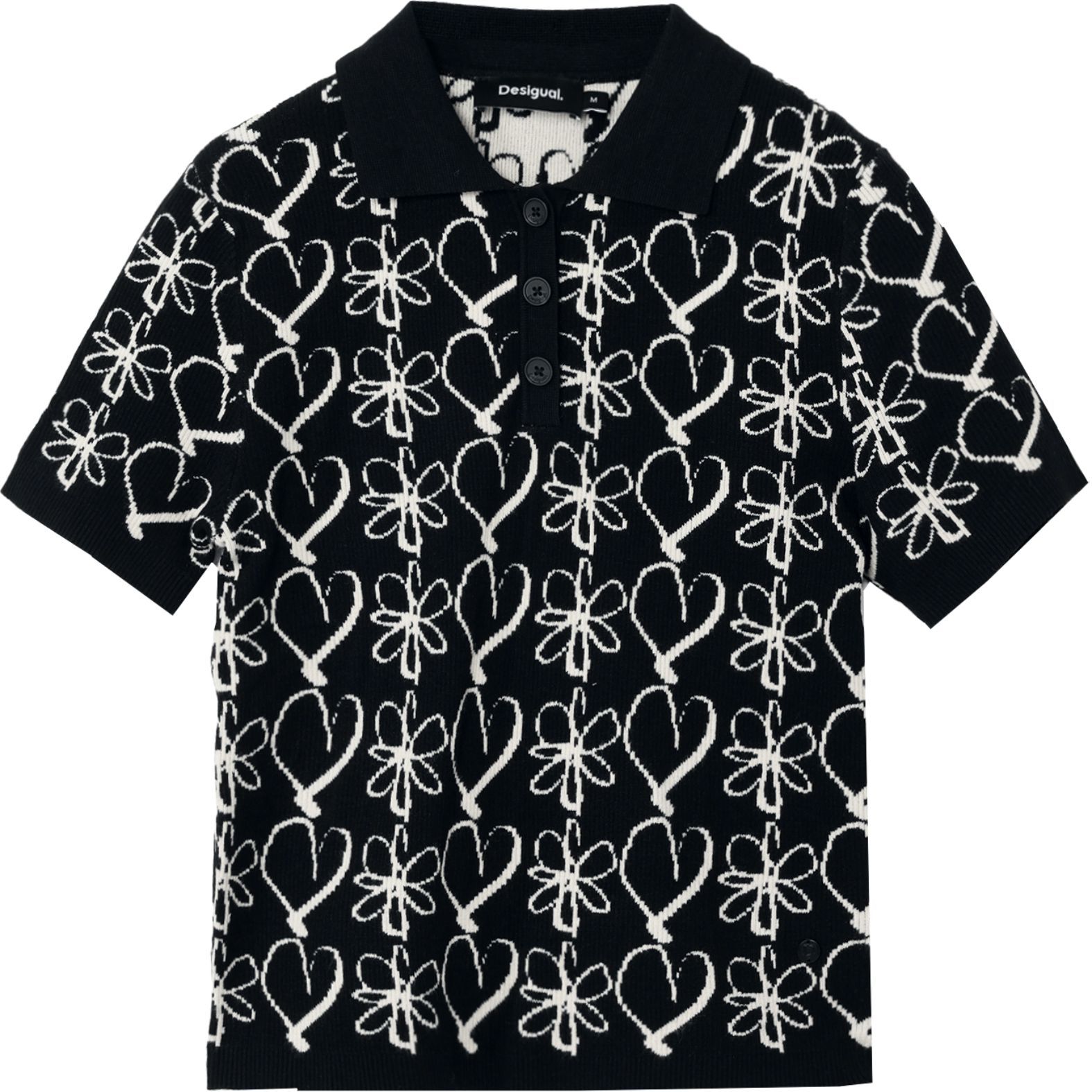 Rövid ujjú póló, passzéval, valamint virág és szív mintával.