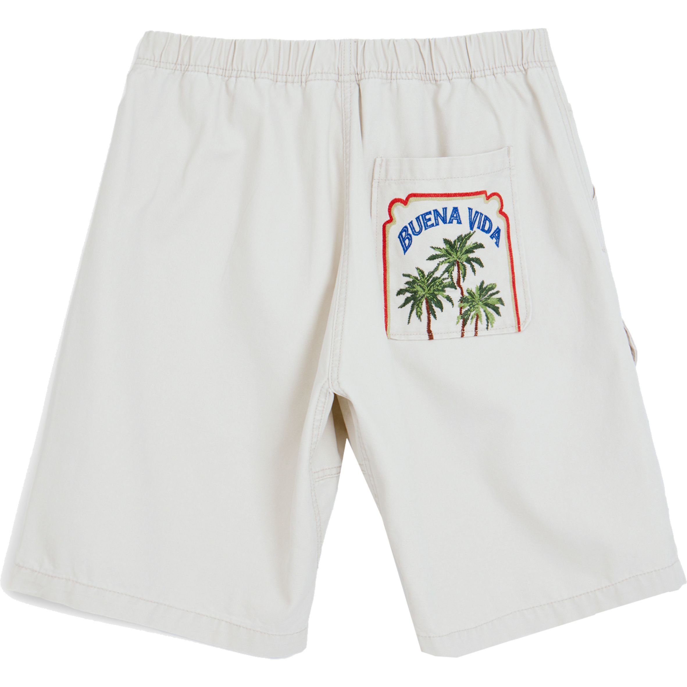 Cargo stílusú bermuda rövidnadrág különböző zsebekkel, gumírozott derékpánttal, cipzáras és gombos záródással, valamint képeslap mintával