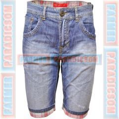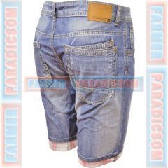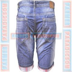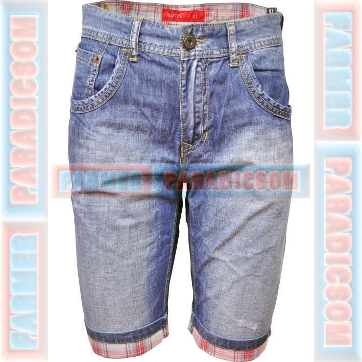 Kellemesen vékony, keresztbe ringelt szövésű, 100% pamut alapanyagból készült férfi farmer rövidnadrág. Combrészén divatos koptatással és szaggatással, alul és felül piros kockás betéttel. Hétzsebes, cipzáras.