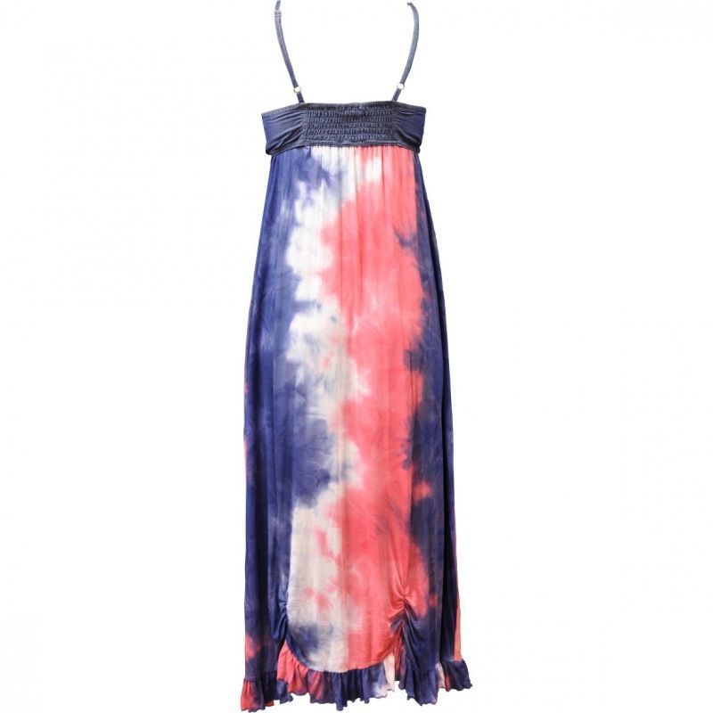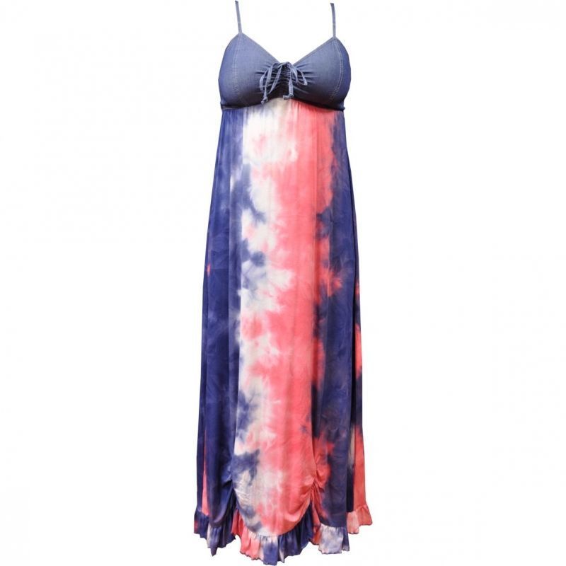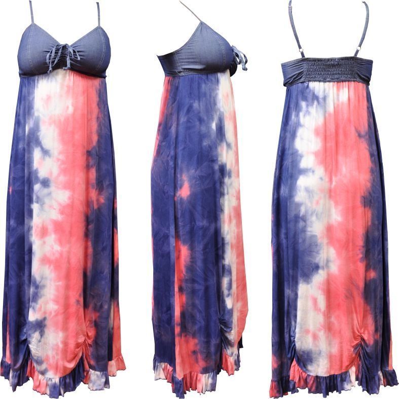 Rugalmas pamut alapanyagú (98% pamut, 2% elasztán), farmer felsőrésszel (100% pamut) készült női ruha. Állítható virslipántos, elöl a mellrésznél kötős, hátul gumírozott. A ruha piros-kék-fehér színű batikolásához könnyű kiegészítőket találni.