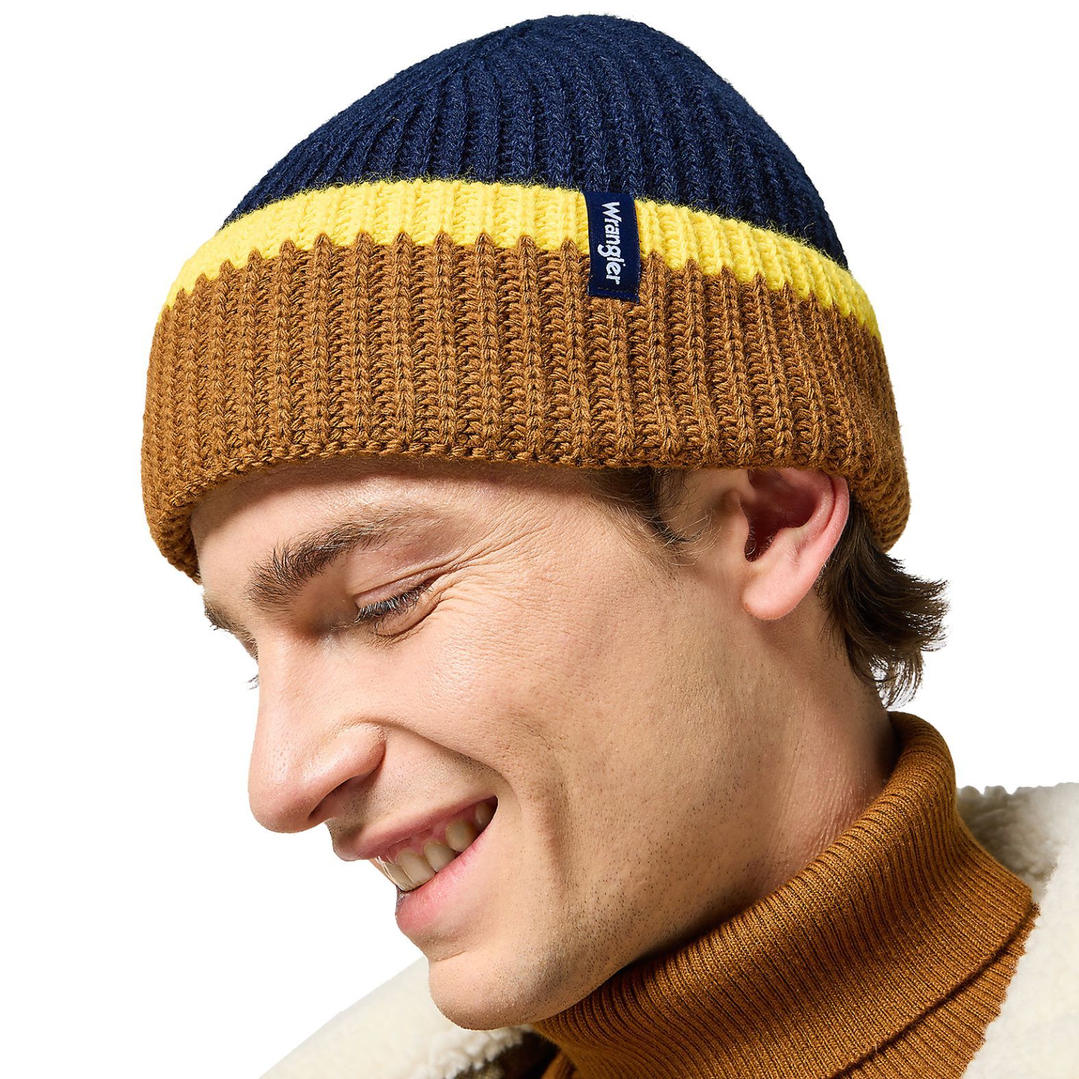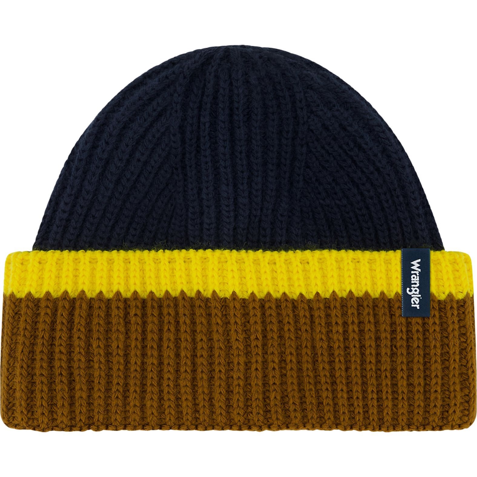 A Wrangler® Sign Off Beanie Blue 112357188 sapka sötétkék színű, klasszikus Wrangler® márkajelzéssel az oldalán.